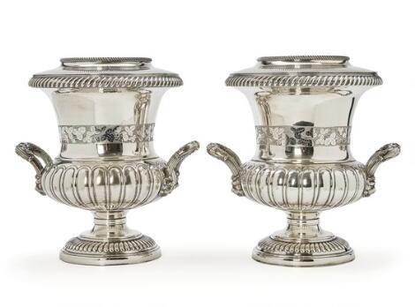 2545/8012LyngbyA pair of silver plated champagne coolers with vine leaves profilings and gadroons. Early 20th century. H. 30 cm. (2)