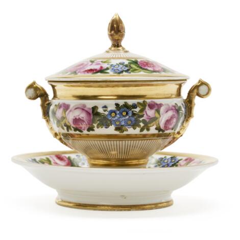 2545/8031LyngbyA French enamelled and gilt porcelain bowl; cover and dish. Marked Sellier et Cie, Paris. 19th century. (2)