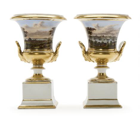 2545/8041LyngbyA pair of German porcelain crater vases with prospects of "Schleswig" and "Kiel". Late-19th century. H. 21.5 cm. (2)