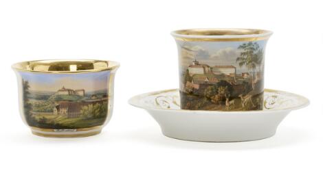 2545/8025LyngbyTwo cups and a saucer with prospect of Ballenstedt. Germany, 19th century. (3)