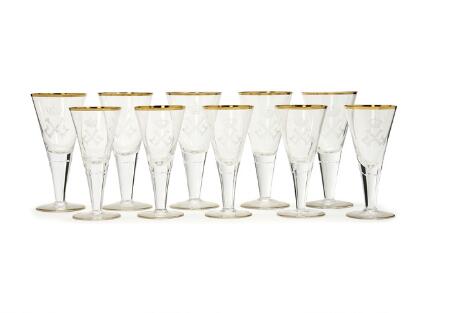 2545/8015Lyngby10 gilt-trimmed conical wine glasses and a silver spoon, all with a crowned L. 1970s. (10+1)