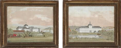 2545/8045LyngbyQueen Marie of Denmark: A pair of embroideries with views of Gottorp Castle. Each 22 x 27 cm. (2)