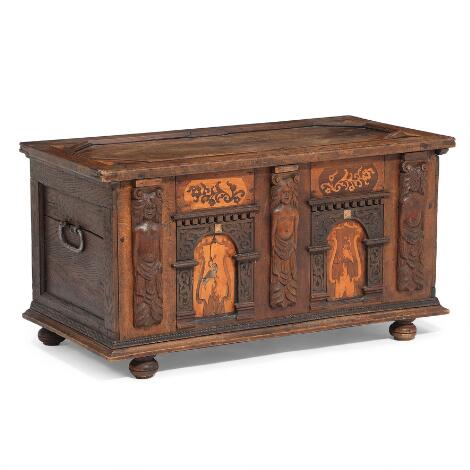 2545/8007LyngbyA small oak lidded chest with Renaissance carvings inlaid with fruit wood. Partly 17th/19th century. L. 114 cm.