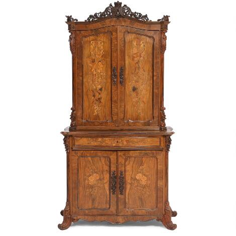 2545/8042LyngbyA Neo-Rococo marquetry silverware cabinet of walnut. Mid-19th century. H. 195 cm. W. 105 cm. D. 50 cm.