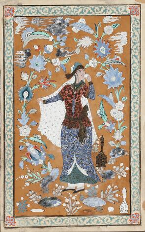 2545/4012LyngbyAn Iranian composition depicting a figure sorrounded by flowers and design. C. 1900. Colour on paper glued to carbon. 31 x 19 cm.