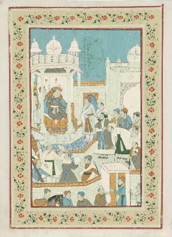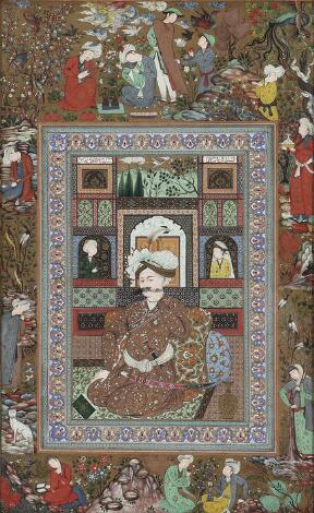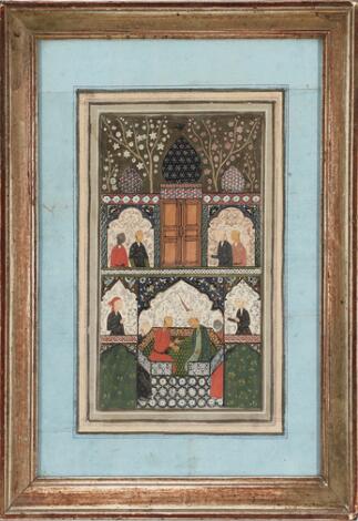 2545/4015LyngbyMahdi Al-Imami, ca. 1900: A nobleman seated with two attendants in a window, borders with numeruous figures and design. Signed Mahdi Al-Imani. 41 x 26 cm.