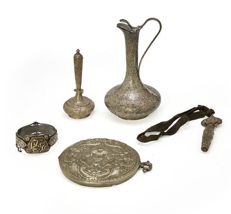 2545/4018LyngbyA group of Islamic silver items comprising of ramrod (handle), back of mirror, two ewers and bracelet. 19/20th century. Weight 601 g. (5
