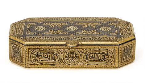 2545/4019LyngbyA 19th century Spanish Toledo gold and damscened box with arabic writing. Defect. L. 6 cm.