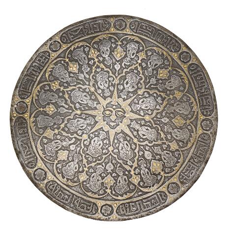 2545/4001LyngbyA gold and steel damscend cover from a Qajar table mirror. 19th century. Diam. 23 cm.