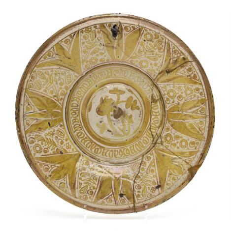 2545/4007LyngbyA 16th century Hispano-Moresque pottery dish. Fragmented. Diam. 32 cm.