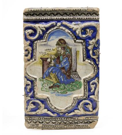 2545/4011LyngbyA 19th century Iranian pottery tile with molded relief and decorated in coloured glaze with figure and design. 50 x 32 cm.