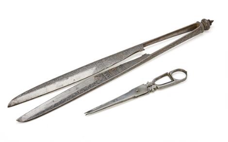 2545/4033LyngbyA pair of Thai "Takrai" steel scissors. 18/19th century. And a pair Ottoman calligraphy 19th century scissor. L. 29/13 cm. (2)