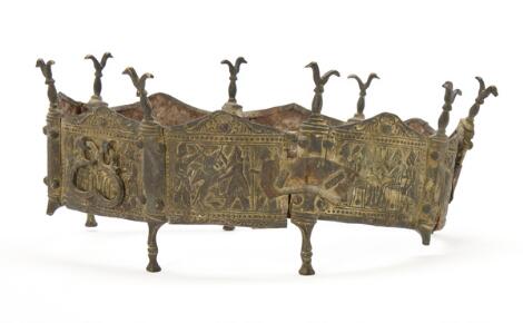 2545/4037LyngbyAn 18/19th century Islamic brass and iron stand chassed with figures. H. 9 cm. Diam. C. 18 cm.