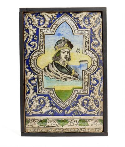 2545/4028LyngbyAn Iranian 19th century pottery tile with molded relief and decorated in coloured glaze with figure and design. 49 x 32 cm.