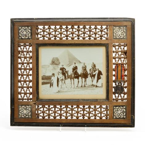 2545/4036LyngbyA photography depicting persorns in front of the pyramids, frame with mother of pearl and with the "Queens South Africa" medal. Photo 16.5 x 22.5 cm.