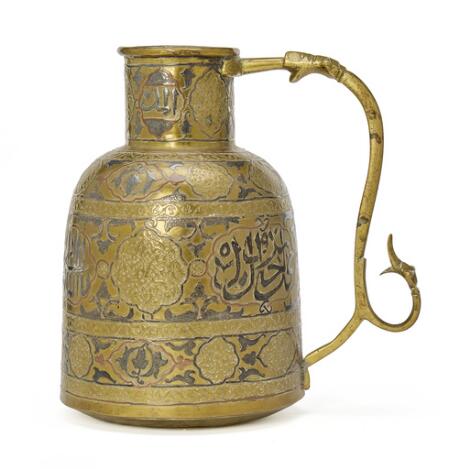 2545/4045LyngbyA Cairoware mixed metal ewer decorated with design and calligraphy. C. 1900. H. 21 cm.
