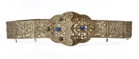 2545/4020LyngbyA 19th century Ottoman silver belt, pierced decoration embossed with stones, indistinct mark. Weight 389 g. L. 92 cm.