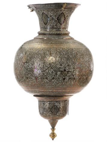 2545/4043LyngbyLarge cairoware pierced brass mosque lamp. c. 1900. H. 77 cm.