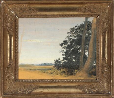 Yellow fields with trees and tree trunks. Unsigned. Inscribed on the stretcher. Oil on paper laid on canvas. 19.5×23.5 cm.