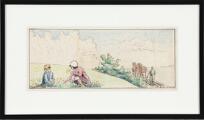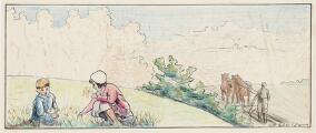 Surrealistic composition. Children picking flowers, c. 1940. Signed Vilh. Bjerke Petersen. Coloured crayon on paper. Visible size 14×33 cm.