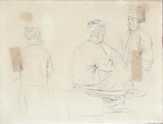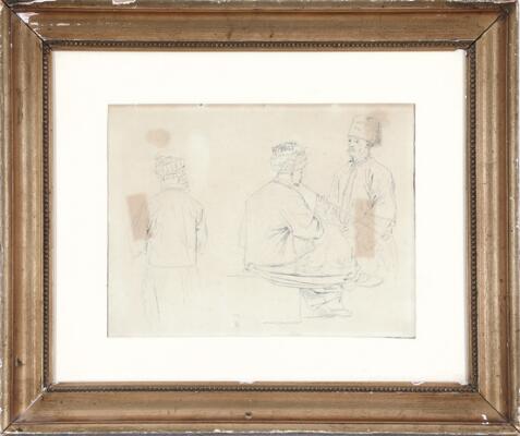 “En siddende græker i hel figur; to stående i halv”. A study of three Greek men. Pencil on paper mounted on paper. Unsigned. Sheet size 20.5×27 cm.
