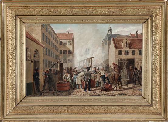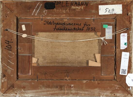 “Ildebrandsscene i Landemærket”. A fire in the street Landemærket in Copenhagen. 1832. Unsigned. Oil on canvas. 24×37 cm.
