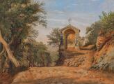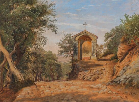Landscape with a Shrine in Tivoli, Italy. Signed P. R. Tivoli, 1841. Oil on canvas. 29×39 cm.