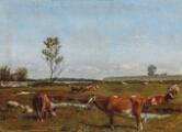 Landscape with grazing cows and sheep. Farum, 1861. Signed on the reverse Fritz Jürgensen. Oil on canvas. 25×33 cm.